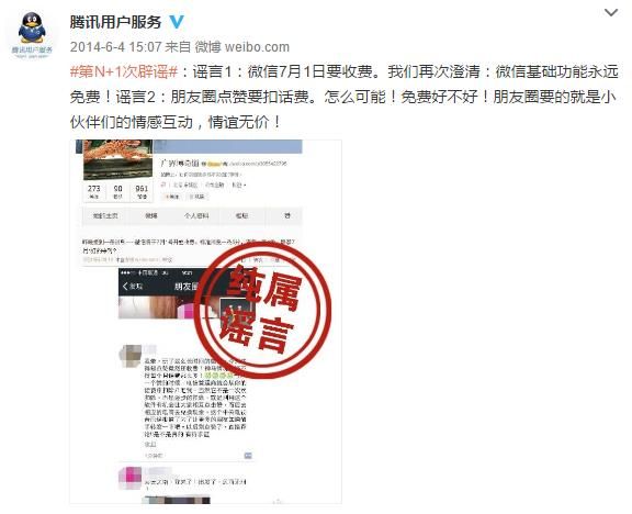 调查发现,这条谣言早在两年前就曾被疯传。2014年6月初,网上传出微信将于当年7月1日开始全面收费的消息,并宣称点赞一次将被电信运营商收取8毛钱。腾讯公司客服微博对此进行辟谣:“怎么可能!免费好不好!朋友圈要的就是小伙伴们的情感互动,情谊无价!”