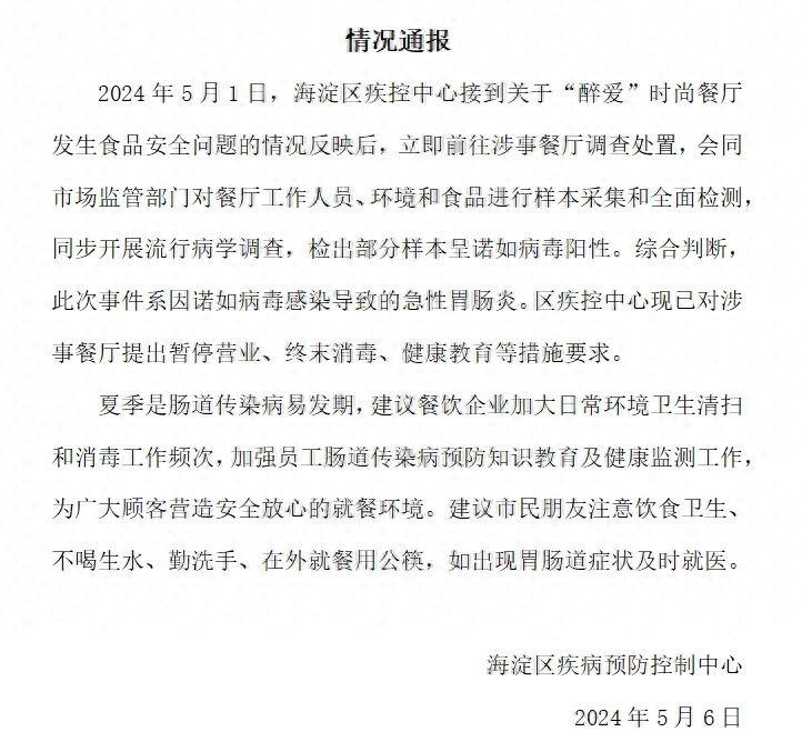5月1日,海淀区疾控中心接到关于“醉爱”时尚餐厅发生食品安全问题的情况反映后,立即前往涉事餐厅调查处置,会同市场监管部门对餐厅工作人员、环境和食品进行样本采集和全面检测,同步开展流行病学调查,检出部分样本呈诺如病毒阳性。综合判断,此次事件系因诺如病毒感染导致的急性胃肠炎。区疾控中心现已对涉事餐厅提出暂停营业、终末消毒、健康教育等措施要求。