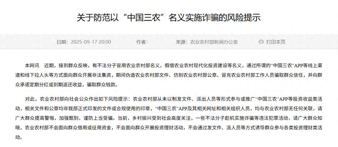 对此,农业农村部向社会公众作出如下风险提示:农业农村部从未以制发文件、派出人员等形式参与或推广“中国三农”APP等投资收益类活动,相关文件和公章均非我部正式印发的文件或合规使用的印章,“中国三农”APP及其相关网址和相关组织人员,均与农业农村部无任何关联,请广大群众提高警惕,加强甄别,谨防上当受骗。当前,乡村振兴受到社会高度关注,一些不法分子趁机实施诈骗等违法犯罪活动,请广大群众知晓,农业农村部不会面向群众借用或征用资金,不会面向群众开展投资理财活动,不会通过发文件、派人员等方式诱导群众参与各类投资理财类活动。