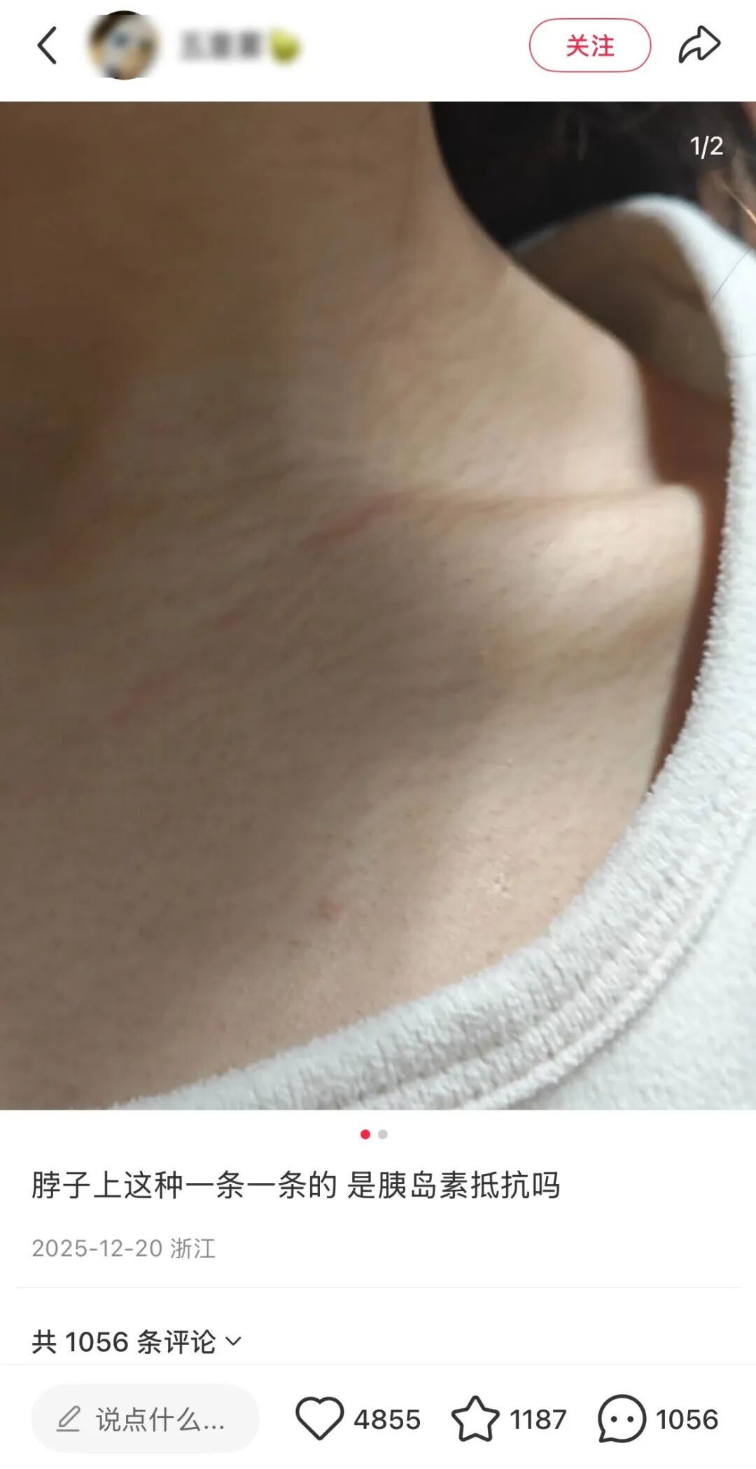 最近有网友发帖求助“脖子上这种一条一条的,是胰岛素抵抗吗”