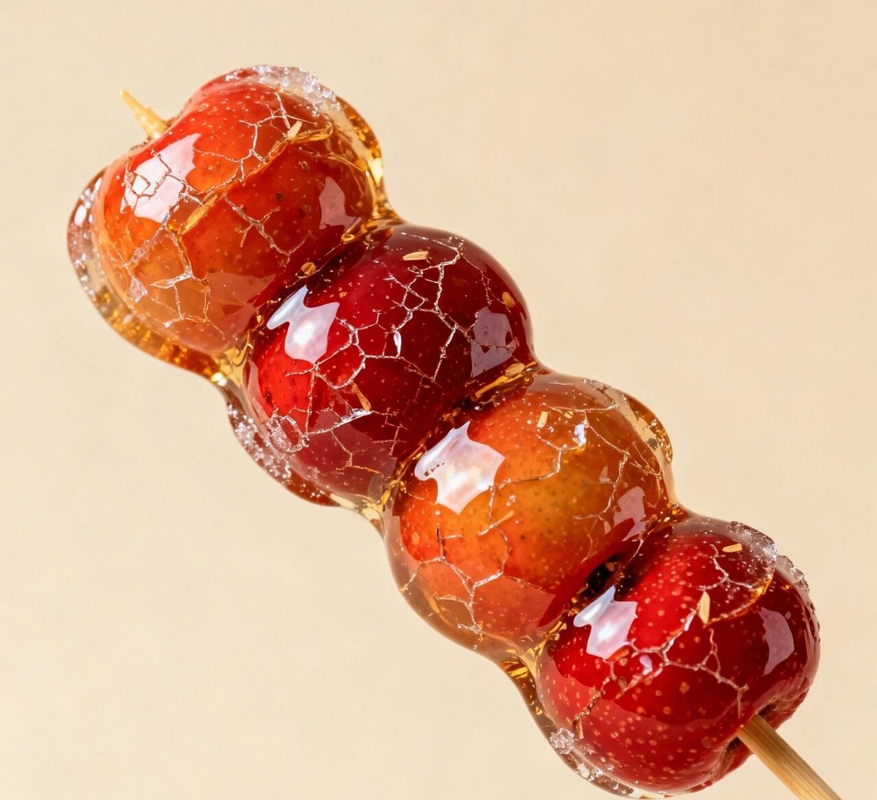 首先,从制作工艺上来看。最正宗的冰糖葫芦做法就是用冰糖熬制糖浆来给串好的山楂裹糖衣。这样做出来的冰糖葫芦,本身就具有外观透亮、口感脆且不粘牙的特点。