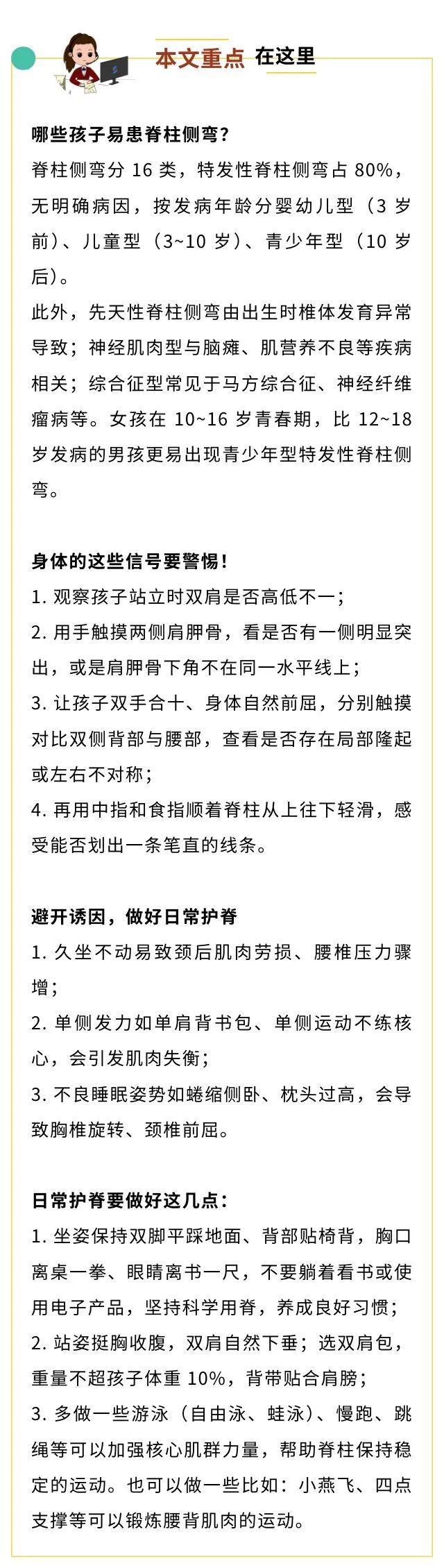 脊柱侧弯的发生与先天因素相关,不良生活习惯也会诱发或加重侧弯,家长要帮孩子避开三大 “坑”: